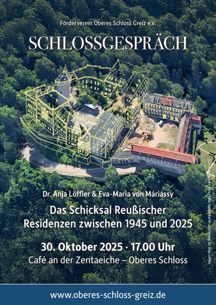 Im „Café an der Zentaeiche“, Oberes Schloss Greiz, referieren Frau Dr. Anja Löffler und Frau Eva-Maria von Máriássy zum Thema „Das Schicksal Reußischer Residenzen zwischen 1945 und 2025“.