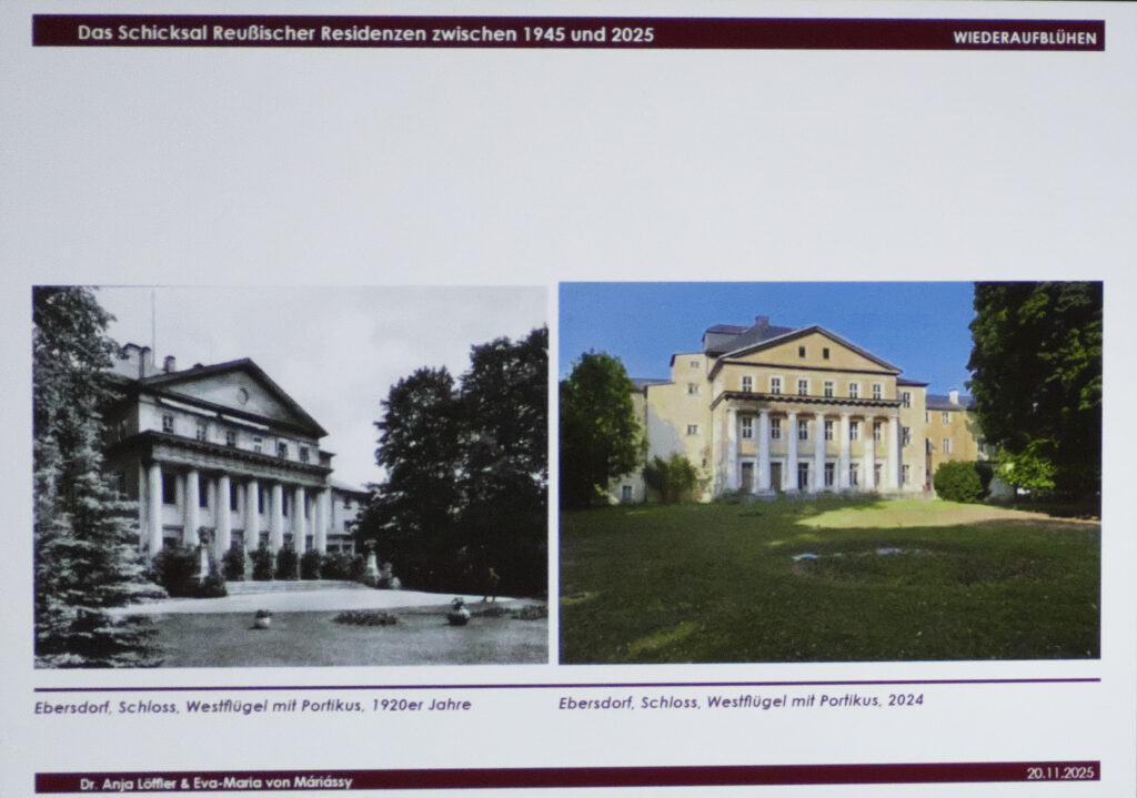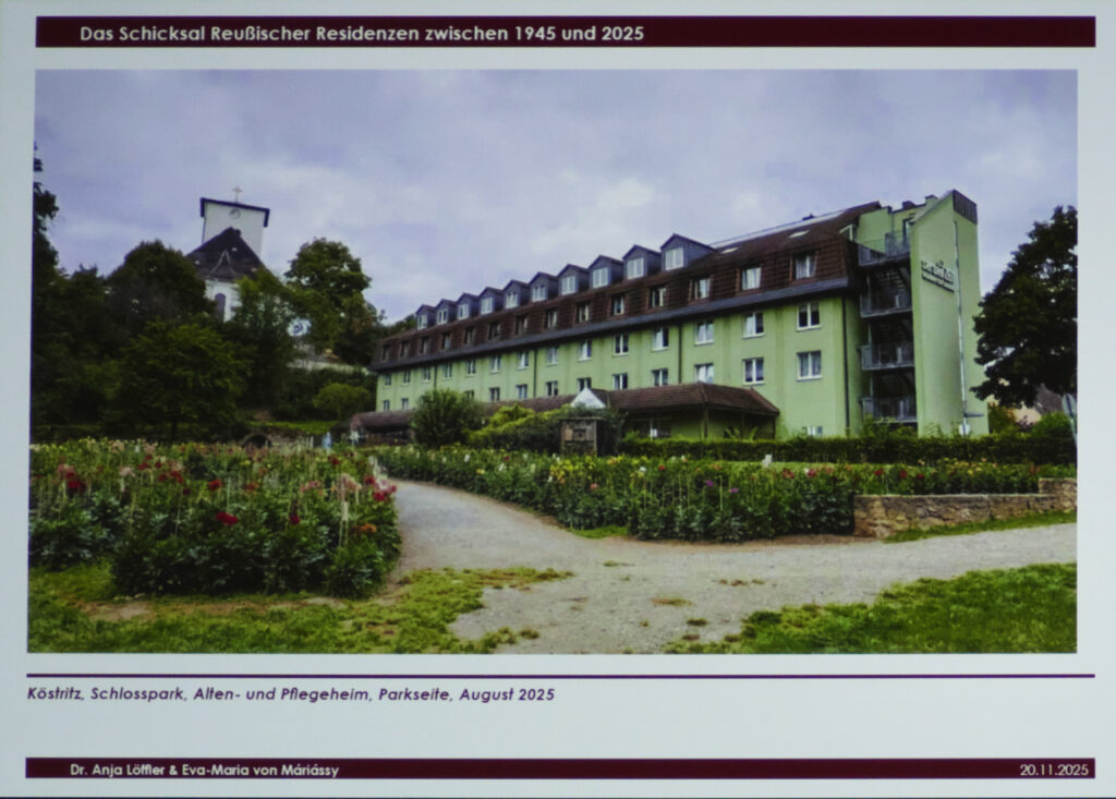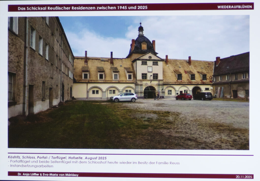 Als weitere Beispiele für die „Kulturverbrechen nach 1945“ nannte Dr. Löffler die Verwahrlosung der fürstlichen Immobilien in der DDR-Zeit mit Schloss Bad Köstritz, dass 1972 abgebrochen wurde. 1995 entstand hier ein Schlosshotel, das heute als Alten- und Pflegeheim genutzt wird. In Bad Köstritz gibt es allerdings auch ein Wiederaufblühen, das ehemalige Torhaus wird durch seinen Reußischen Eigentümer zu einem „kleinen barocken Schatzkästlein“ saniert.
