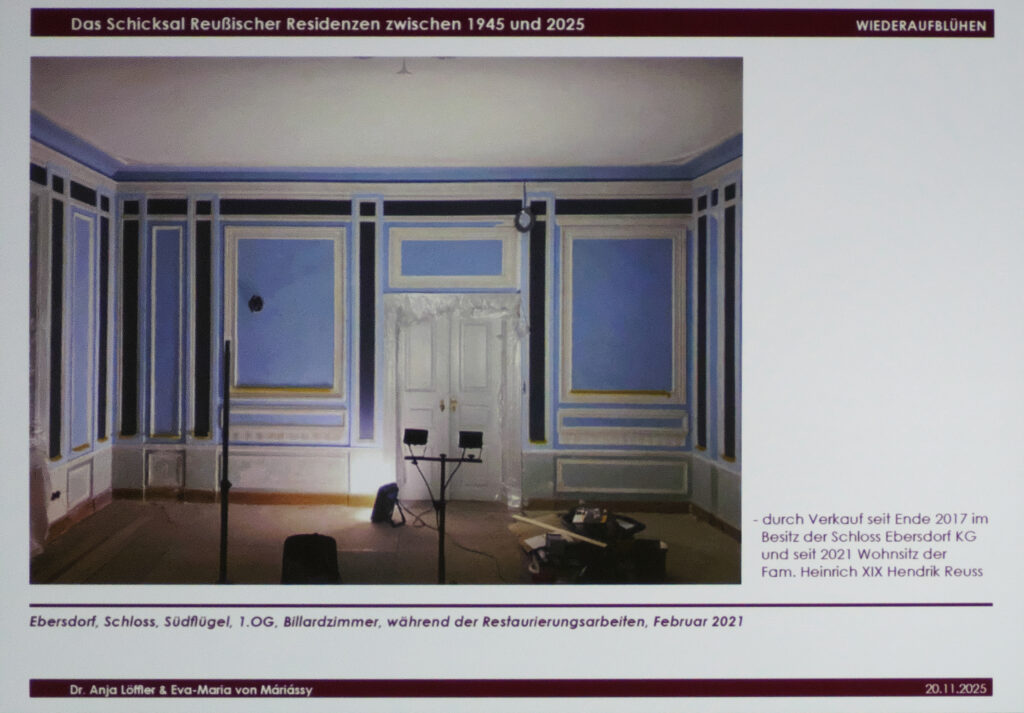 Sie gaben einen Überblick über für immer zerstörte sowie sanierte und restaurierte Schlösser und konzentrierten sich dabei auf zehn Reußische Höfe: prachtvolle Schlösser, Orte höfischer Kultur und Zentren politischer Macht der Reußen Älterer und Jüngerer Linie.